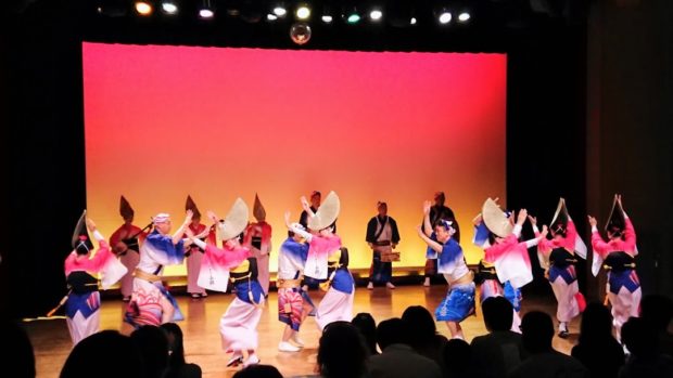 The lights went down, and the dance began. Against a backdrop of sunset hues, the dancers moved to the upbeat drum-and-flute music, roaming the stage as if in a street procession. With alternating hand movements above their heads and leaning forward on the tips of their platforms, the women called back to the words of the men (“Yattosa! / A, yatto, yatto!” – “It’s been a while, how are you?”). It was a mesmerising spectacle.